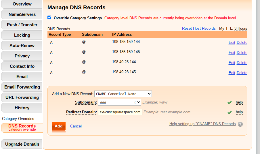 | @ (no subdomain) | A | 198.185.159.144 (You have already entered this one if you have followed the step above) |